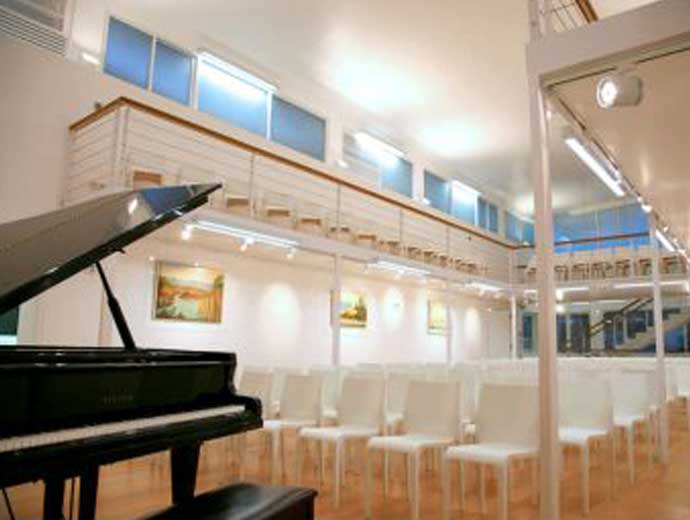 Wooden floors, vaulted ceilings, grand piano, tall windows for natural light, gallery standard hanging system and a mezzanine balcony.