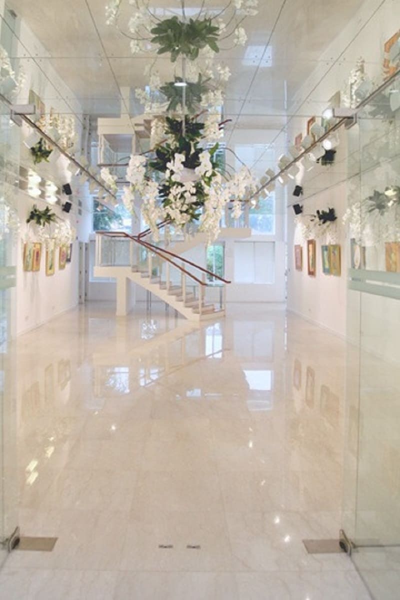 Marble floors, mirrored ceilings; iconic staircase; full glass doors; gallery standard hanging system, adjustable lighting. Access to the garden and parking; use of side rooms for private dining, or dressing room.